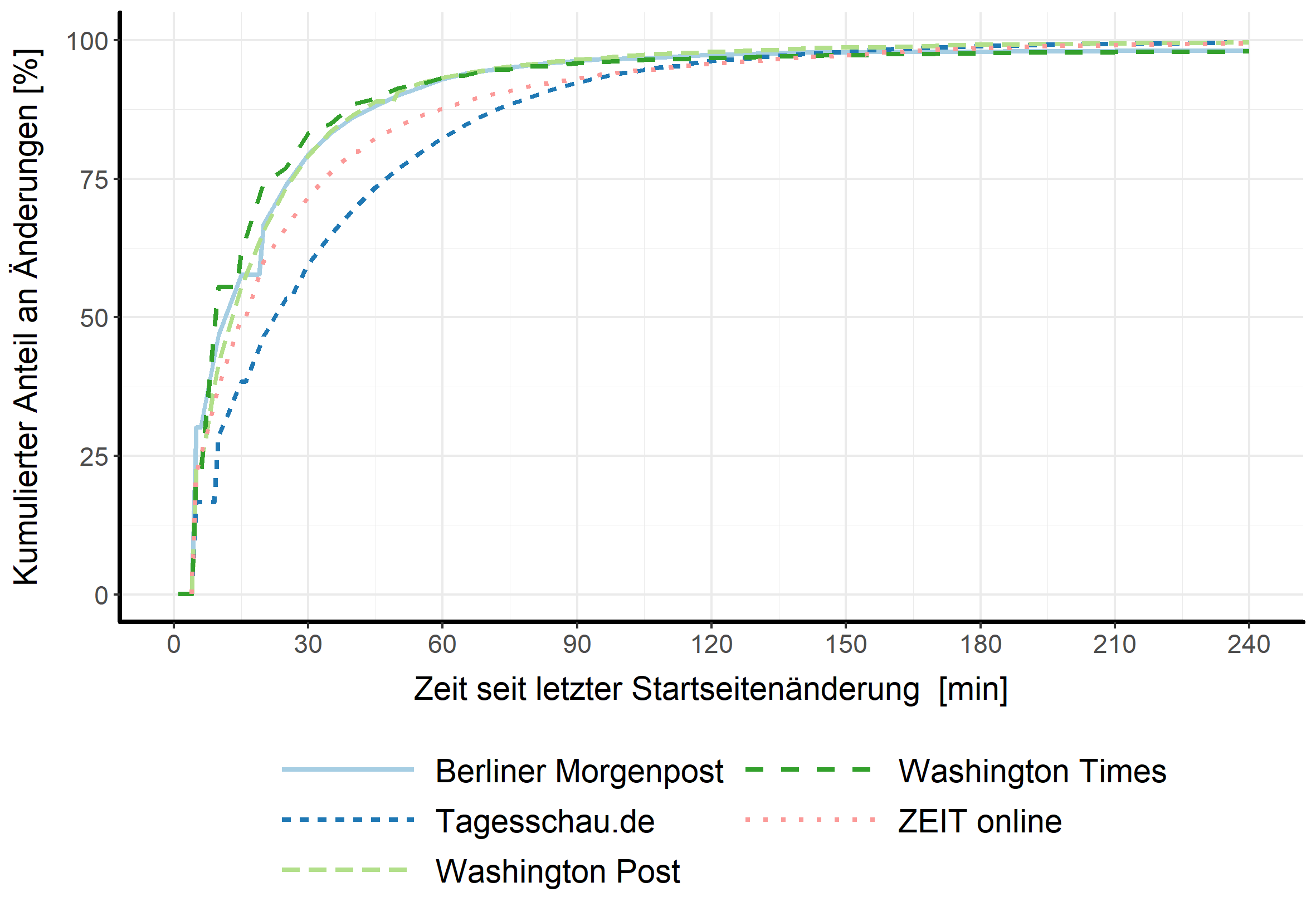 Die Aktualisierungsmuster verdeutlichen die Schnelllebigkeit des Internets: Redaktionelle Startseiten ändern sich im Mittel alle M = 6.1 Minuten, wobei insgesamt 94 Prozent aller Aktualisierungen der redaktionellen Startseiten in der automatisierten Online-Beobachtung auf neue oder depublizierte Beiträge zurückzuführen sind; ein ausschließliches Umsortieren von bestehenden Beiträgen findet nur sehr selten statt, am ehesten noch bei der Washington Post. Einzelne Beiträge weisen entsprechend eine Lebensdauer auf den redaktionellen Startseiten von M = 5.2 (ZEIT online) bis M = 12.6 (Washington Times) Stunden auf. Das ist offenbar nur zum Teil auf geänderte Ereignislagen zurückzuführen; vielmehr wird in den ExpertInneninterviews deutlich, dass etwa in Redaktionskonferenzen der Eindruck entstehen müsse, die redaktionelle Startseite habe sich im Vergleich zur letzten Konferenz verändert. Die Wahrscheinlichkeit eines Beitrags, auf der redaktionellen Startseite zu überleben, steigt dabei mit dem Auftauchen in den Listen meistgeklickter Beiträge bei den beiden US-Redaktionen (Washington Post, Washington Times), wohingegen sie bei der Berliner Morgenpost und ZEIT online sinkt. Bei Tagesschau.de hat das Auftauchen in der Liste meistgeklickter Beiträge keinen Einfluss auf das weitere Überleben eines Beitrags auf der redaktionellen Startseite. Änderungen erfahren rund 30 Prozent aller Beiträge nach ihrer Veröffentlichung, sowohl an ihrer Überschrift als auch an ihrem Titelbild; etwa die Hälfte dieser Beiträge mehr als einmal. Beitragsänderungen erfolgen dabei ebenfalls eher nach dem Auftauchen von Beiträgen in den Listen meistgeklickter Beiträge.