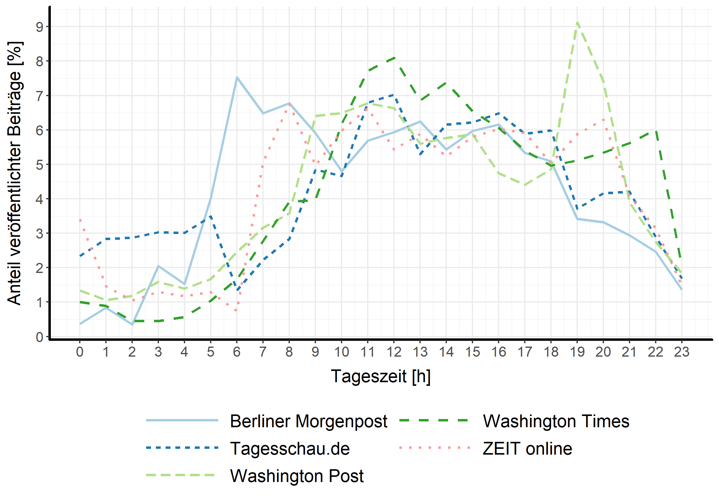 Die Befunde zeigen zunächst sehr einheitliche Publikationszyklen auf. Sie richten sich offenbar nach der lokalen Mediennutzung und dabei nach der regelmäßigen und langen Internetnutzung, insbesondere durch Smartphones. Beiträge werden also vor dem Frühstück, zur Mittagspause und am Abend publiziert und folgen einem klassischen Werktagsrhythmus.