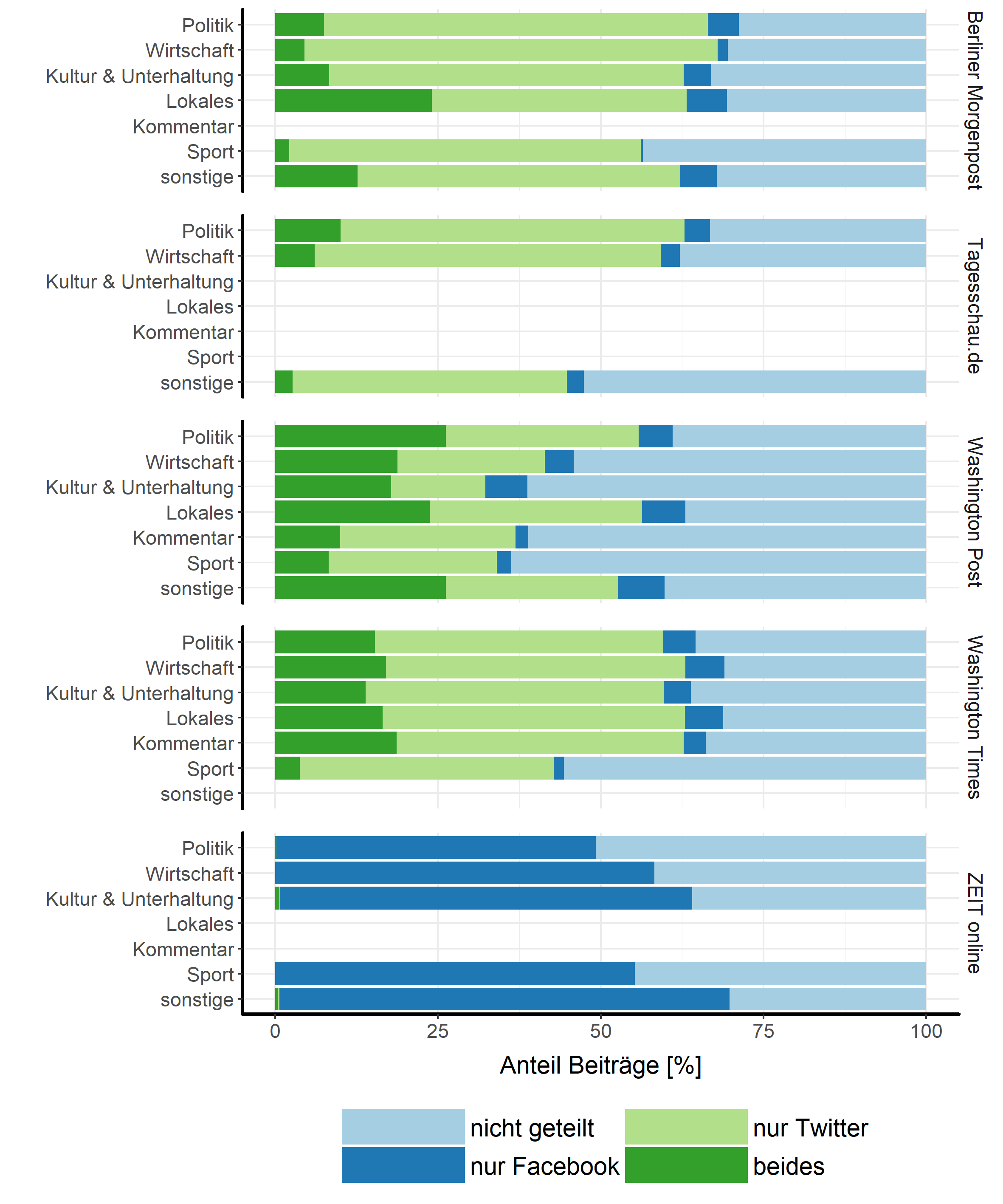 Im Gegensatz dazu unterscheiden sich Distributionsmuster je nach Intermediär und Redaktion. So wird bei Twitter verhältnismäßig ungefiltert und (vermeintlich) automatisiert publiziert, wohingegen die Redaktionen im Mittel nur etwa jeden vierten Beitrag dezidiert für die Veröffentlichung bei Facebook auswählen. Geteilt wird dabei durchweg, was vorher von NutzerInnen geklickt wurde. Die für Facebook ausgewählten Beiträge versehen die Redaktionen darüber hinaus mit anderen Überschriften und Teasern, in denen auch etwas mehr Emotionalität auszumachen ist. Für Twitter sind die Befunde weniger einheitlich: Die Berliner Morgenpost bleibt dort sehr nah an der Formulierung der Überschriften der redaktionellen Startseite, wohingegen etwa Tagesschau.de zahlreiche Hashtags ergänzt; ZEIT online „verleiht“ wöchentlich das Twitter-Profil an JournalistInnen im eigenen Haus.